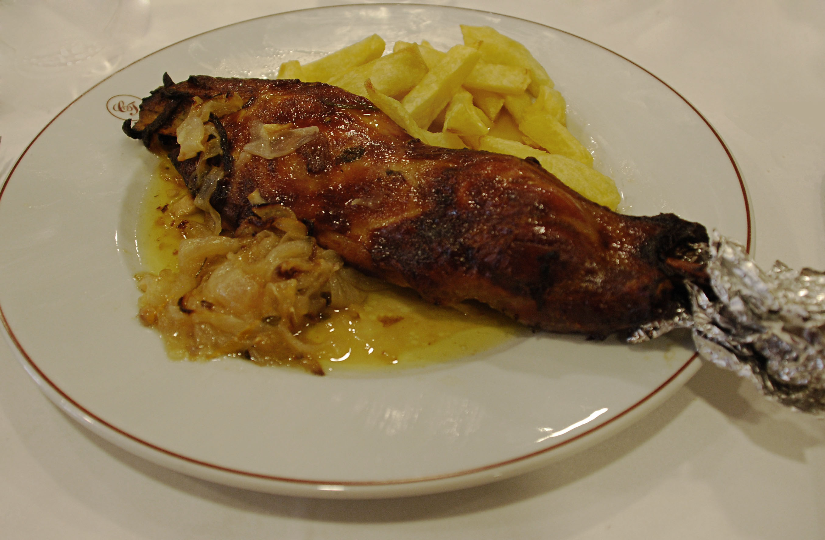 Finalmente, el que en mi opinión es el plato estrella de la casa es la paletilla de cabrito asada, servida con patatas fritas y cebolla. Debo reconocer que me enamoró desde el primer bocado. Nunca había probado una paletilla tan sabrosa. Además, las cebollas asadas al horno combinaban a la perfección con la carne, suavizando ligeramente el sabor fuerte del cabrito.