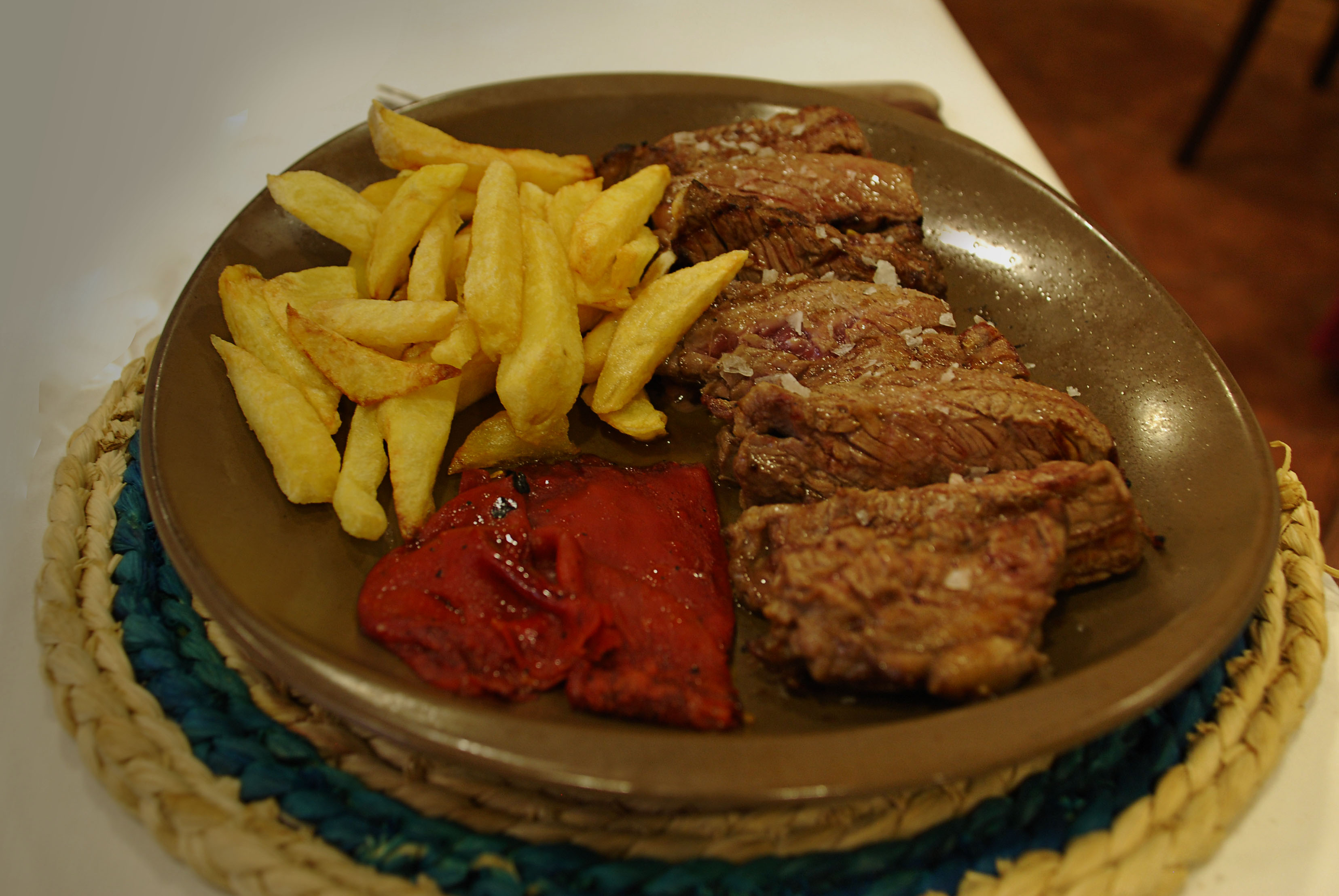 Por otro lado, pudimos degustar un suculento entrecot de buey acompañado de patatas fritas y pimientos asados. La carne estaba hecha justo en su punto, muy tierna y deliciosa.
