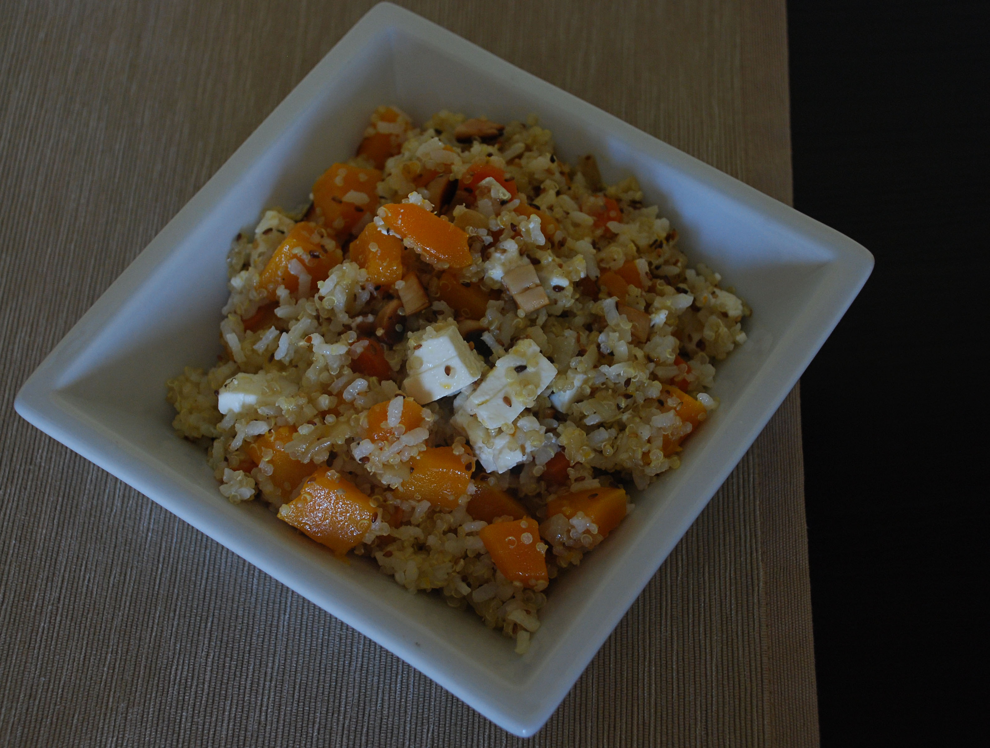 Luego pelamos el melocotón y lo troceamos a daditos pequeños. Limpiamos las fresas y las laminamos. Por último, sacamos el rulo de cabra del frigorífico (Es importante que no lo saquéis hasta el final porque con el calor se reblandece y es más complicado cortarlo) y lo hacemos daditos.